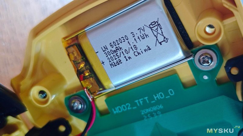 Электропитание устройства осуществляется от литиевого аккумулятора типоразмером 602030 с ёмкостью 300 мАч по напряжению 3,7 В или 1,11 Вт*ч.