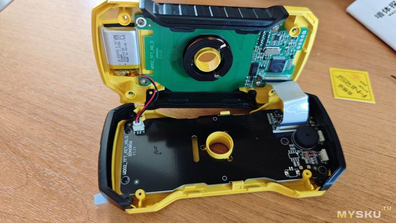 Вокруг отверстия мы видим резонансный контур в виде катушки из тонкого медного провода, которая и создаёт электромагнитное поле. Прибор анализирует изменение амплитуды и частоты резонанса, когда в его поле попадает металл или меняется плотность материала — так обнаруживается дерево.