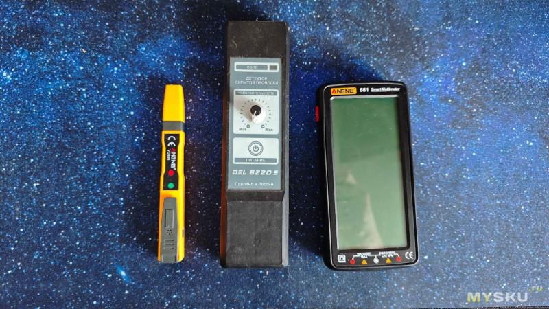 Ну и самый наверное интересный с точки зрения домашнего использования опыт с поиском скрытой проводки я проведу методом сравнения с другими, имеющимися у меня приборами: ANENG VD806 указатель напряжения с функцией поиска скрытой проводки, мультиметр ANENG 681 с той же функцией и детектор скрытой проводки отечественного производства DSL 8220S.