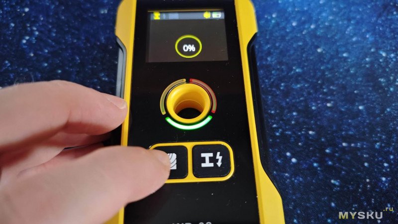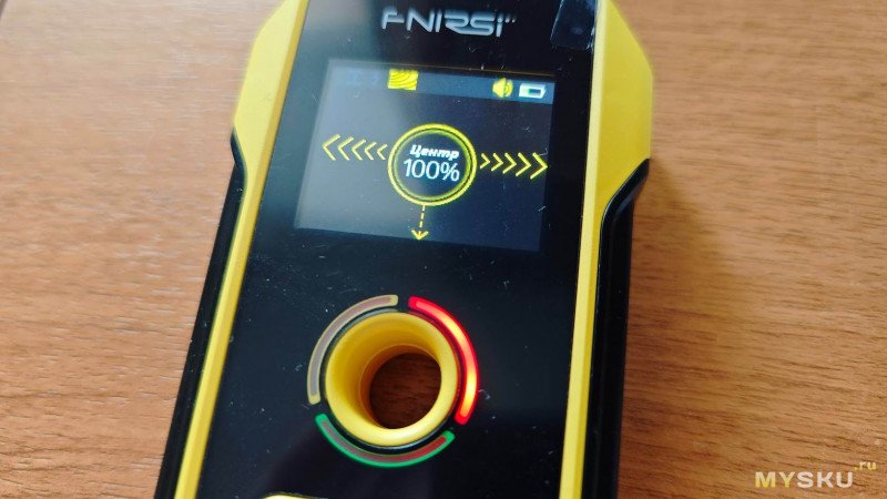 Процентный индикатор дублирует шкалу уровня сигнала цифрами (0–100%). Максимальное значение (обычно выше 90%) сопровождается надписью «ЦЕНТР» — это значит, что объект находится ровно под центральным отверстием прибора.
