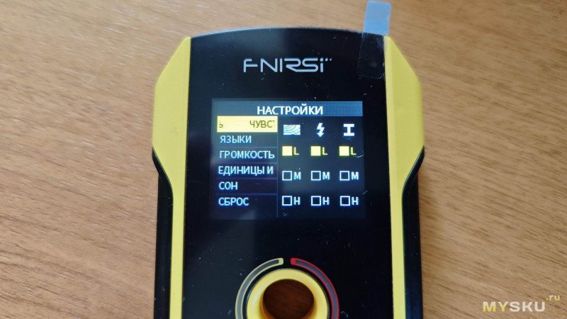 Вот теперь всё в порядке. Первый пункт меню это выбор чувствительности прибора. Для каждого типа измерения можно выбрать свой уровень в 3 позициях: L — low (низкая), М — medium (средняя), H — hight (высокая). Такая трехуровневая регулировка чувствительности повышает точность измерений. Она может использоваться для обнаружения металлических балок, труб, проводки в стенах, древесины на потолках или в полах.
