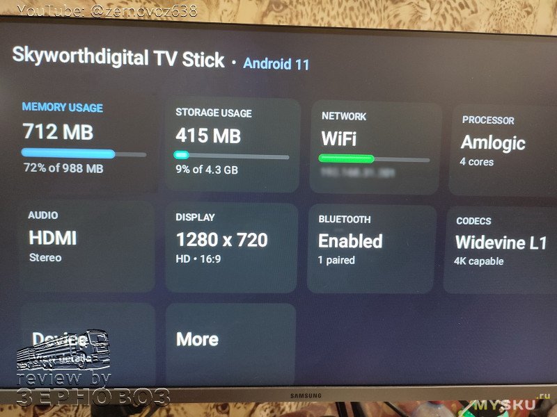 Выход видео: поддерживает 1080p через HDMI, а также растягивает 720p интерфейс до 1080p. Т.е. Слабое звено устройства — именно указанная смарт‑платформа. Несмотря на физическую Full HD матрицу, TV‑стик работает в HD 720p, что влияет на UI, воспроизведение YouTube и запуск приложений. Из хорошего — по кабелю или через внутреннюю оболочку всё ок.