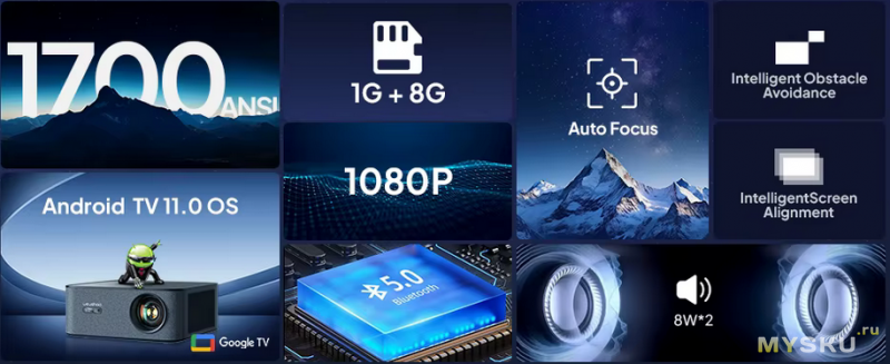 Это уже прямо новый тренд. Full HD проектор с закрытой оптической системой и целых 1700 люмен. А также акустика 2×8Вт и система автоматической коррекции изображения. Производитель позиционирует его как проектор на все случаи: фильмы, сериалы, YouTube, игры.