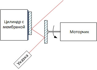 На ось моторчика с помощью термоклея-сопли прикрепите ещё одно зеркальце. И лазером светите сначала на него, а отражённую развёртку — уже на зеркальце на мембране.