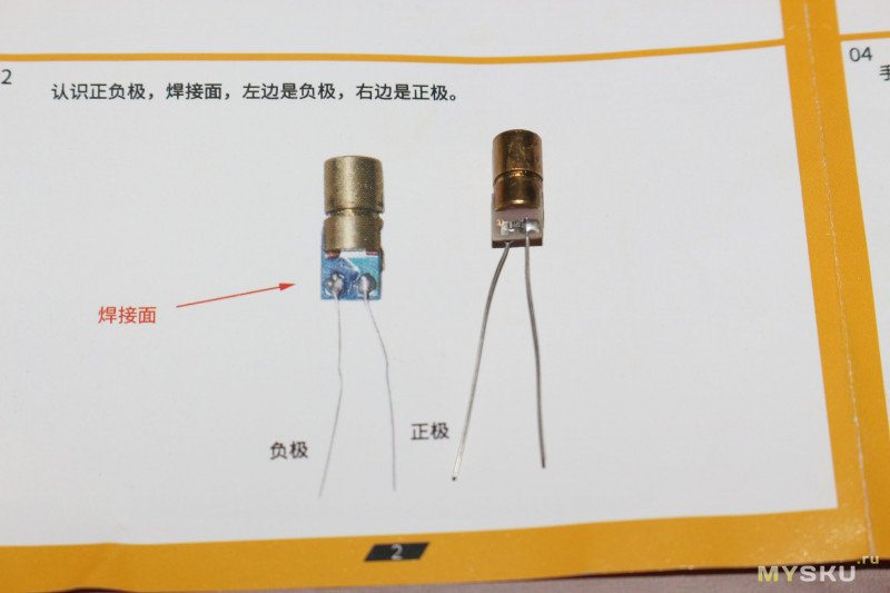 Единственный момент — лазер в инструкции и в комплекте визуально отличаются. Хорошо, что плюсовая ножка у него стандартно длиннее, так что с определением полярности вопросов не возникло.