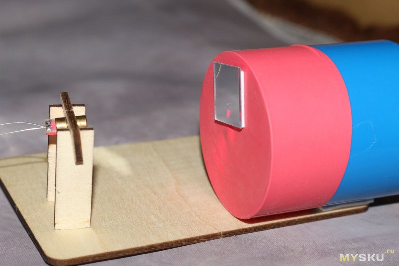 Зеркальце на оси мотора невозможно закрепить идеально перпендикулярно оси вращения. Т.е. зеркальце при вращении непременно будет немного колебаться, «гулять», что нам и нужно.