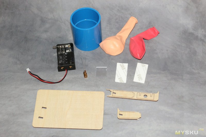 Что входит: несколько кусков фанеры с выпиленными лазером деталями, отрезок пластиковой трубы, два надувных шарика, кусок пластикового зеркала, пара фрагментов двухсторонней клейкой ленты, лазерный диод, холдер для 2-х батареек АА.