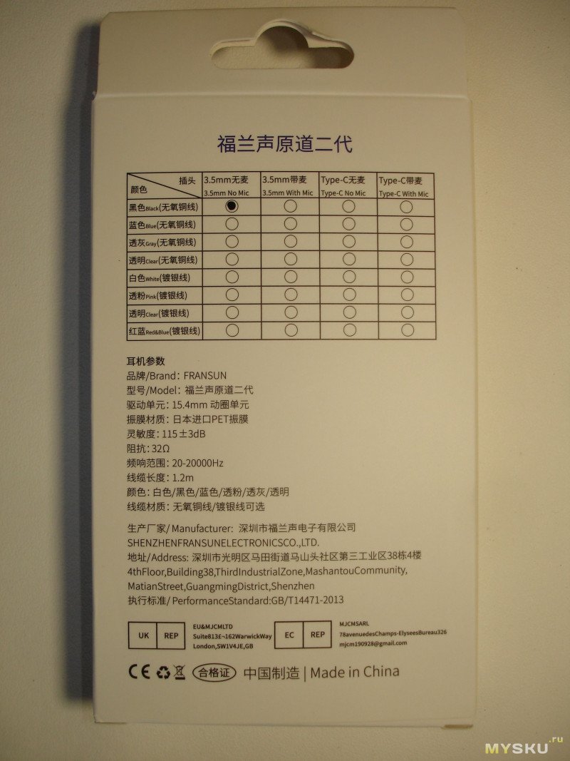 Сзади указаны технические характеристики. Я заказал чёрные, штекер 3.5мм, без микрофона: