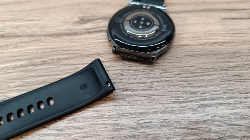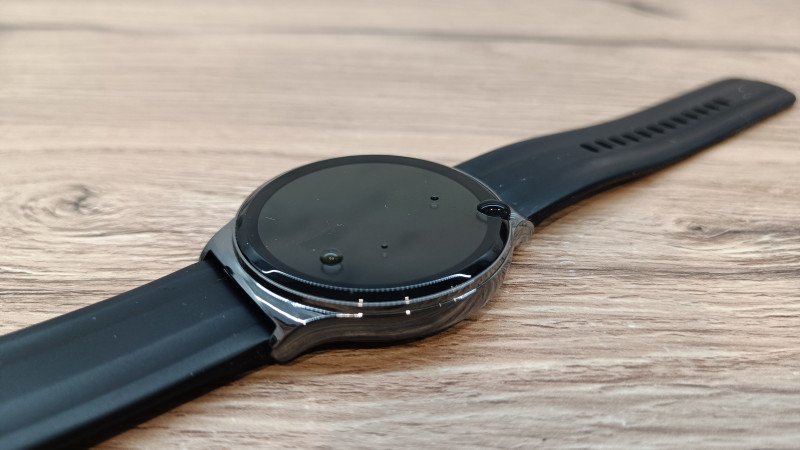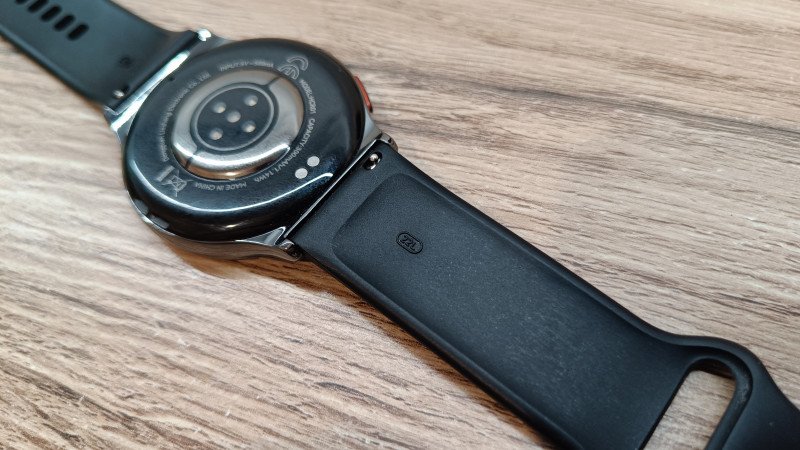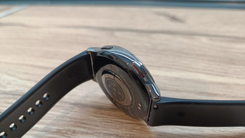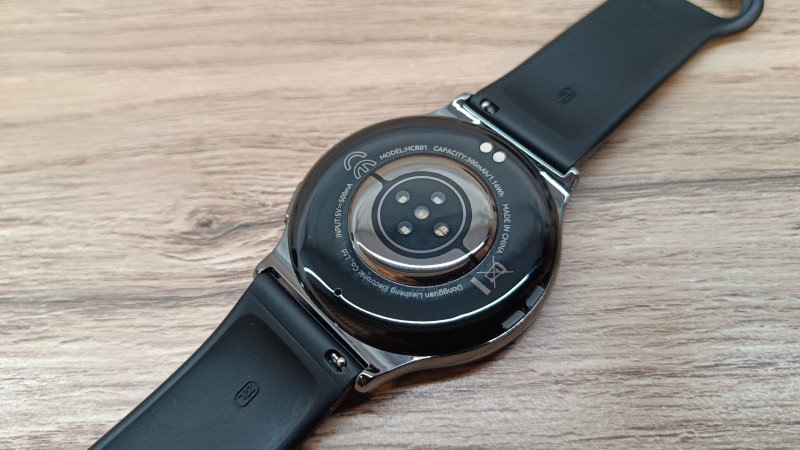 Корпус часов имеет круглую форму диаметром 46 мм, а толщина менее 10 мм. Производитель указывает как 9,8 мм. Нижняя часть корпуса из металлического сплава с вставкой пластика. На этой вставке есть несколько датчиков для отслеживания пульса и контакты зарядки. Основным датчиком выступает пульсометр. Остальные в деталях не раскрываются. А еще с торцов есть несколько отверстий. Под одним из них динамик, в другом микрофон для телефонных разговоров.