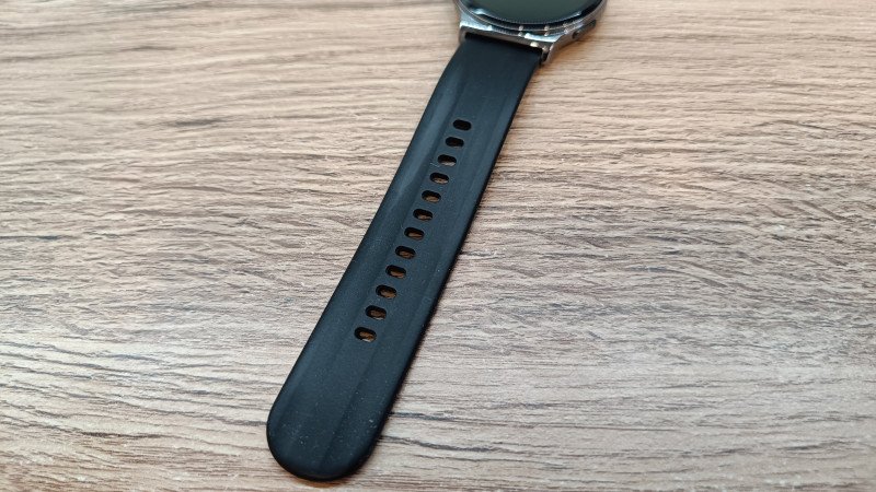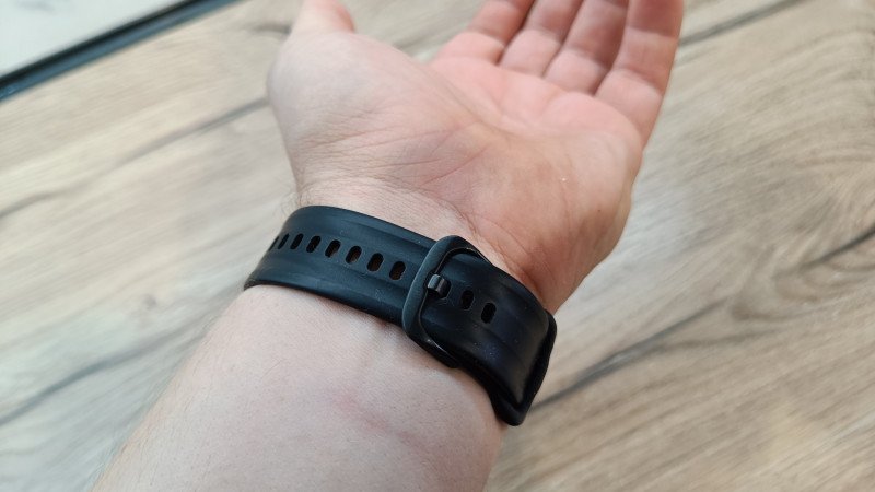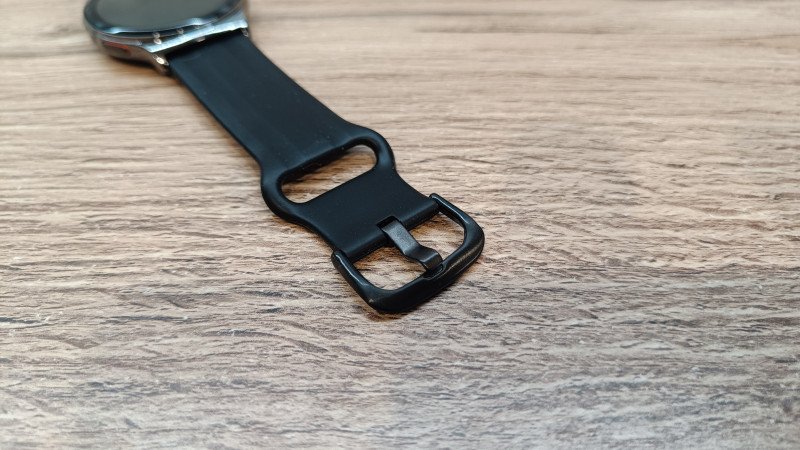 В комплекте идёт мягкий черный силиконовый ремешок, который не вызывает раздражения на коже. Во всяком случае, после недели использования у меня все отлично. Но в летний период под ним может отпотевать, так как он выполнен сплошным, без вентиляционных отверстий. Ремешок регулируется под руку практически любого размера. На мужской руке, застегивается почти на последние отверстия. Регулировка за счет металлической пряжки. И не совсем обычно для меня стала фиксация другого кончика ремешка. Она не продевается через колечко, а вставляется в прорезь на самой застежке. Ремешок можно сменить на другие варианты, посадочный размер 22 мм.