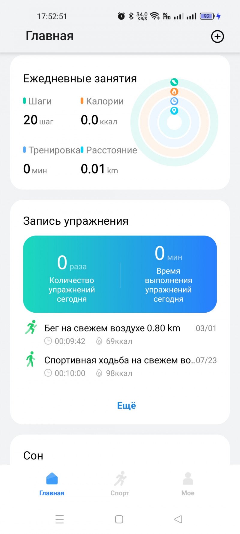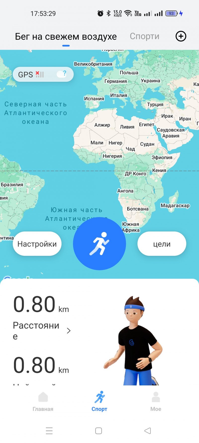 Вкладка спорт содержит все спортивные режимы не позволяют использовать их на улице режима GPS смартфона. При этом будет отображаться карта и маршрут движения различные параметрами скорости и пройденного расстояния. Через мобильное приложение можно углубленно настроить различные режимы отображения, спортивные режимы и другие опции. Также есть возможность обновления прошивки.