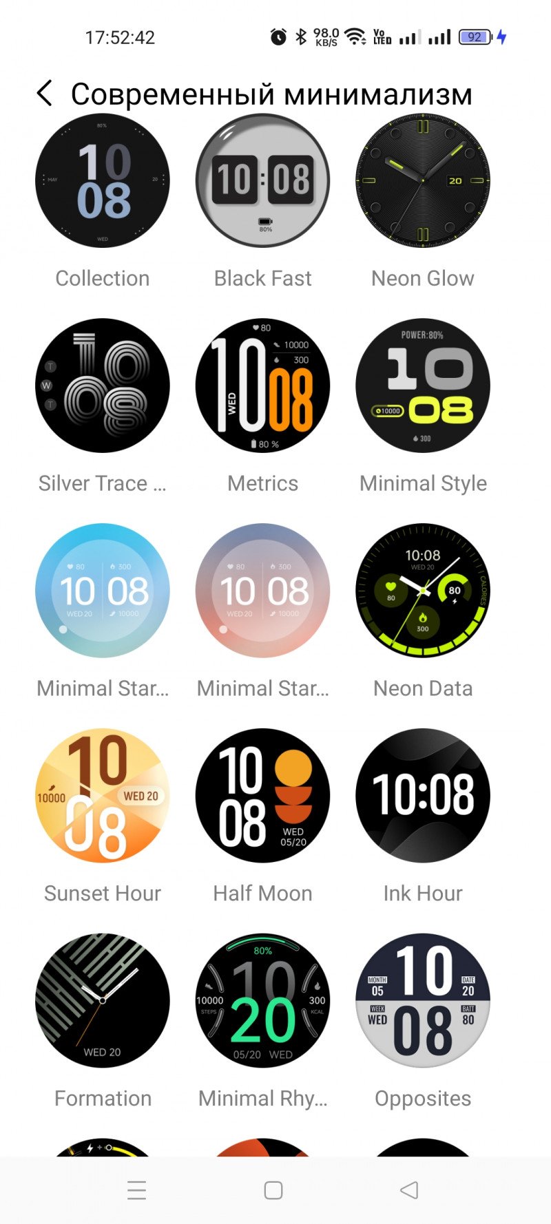 Используется более продвинутый Амолед экран с разрешением 466*466 точек. Он значительно лучше, сочнее и ярче, чем более дешёвые TFT-экраны. Рамки вокруг экрана в несколько миллиметров, но при черных экранчиках они становятся незаметными. У защитного стекла есть небольшая фаска, а не просто закругление. На выбор доступно огромное количество циферблатов, а если не подойдут, то можно создать свой в приложении. Интерактивные виджеты есть, но на очень ограниченном количестве циферблатов и создать такие не получится. Обычно я использую классику или цифровые варианты на темных тонах.