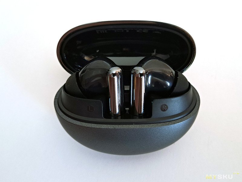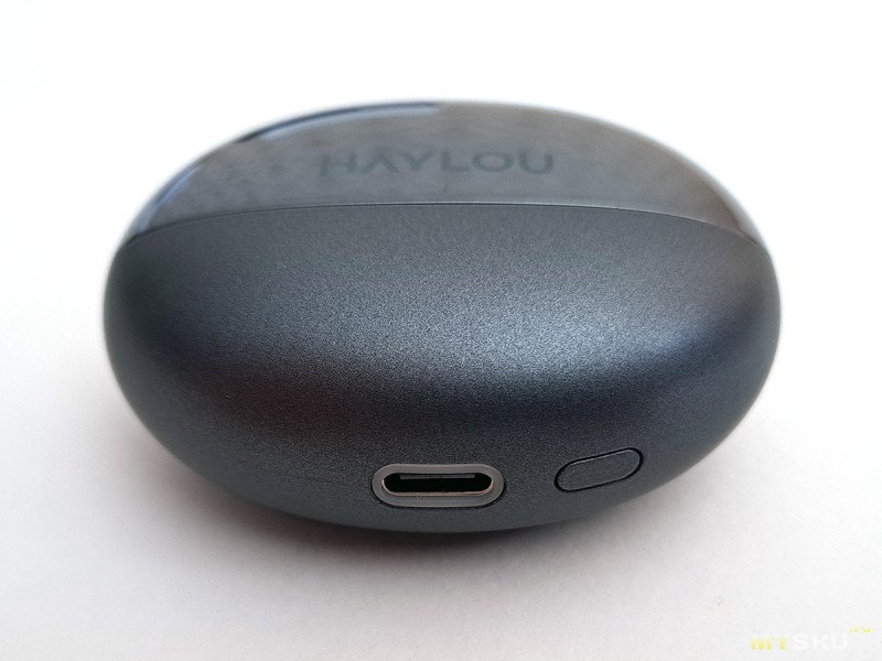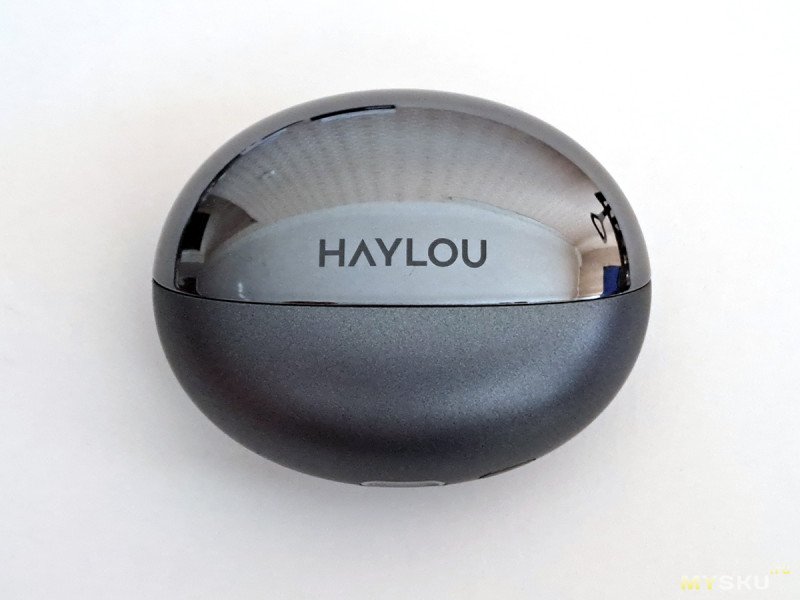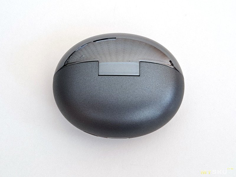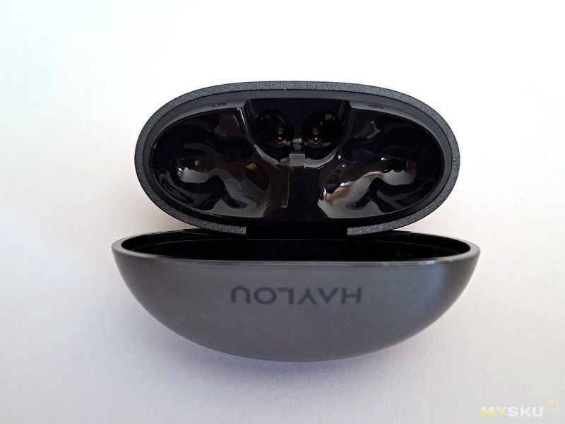 Наушники в своем ложе удерживаются традиционными магнитами. На верхней крышке указаны технические данные. В нижней части контактные площадки для подзарядки.