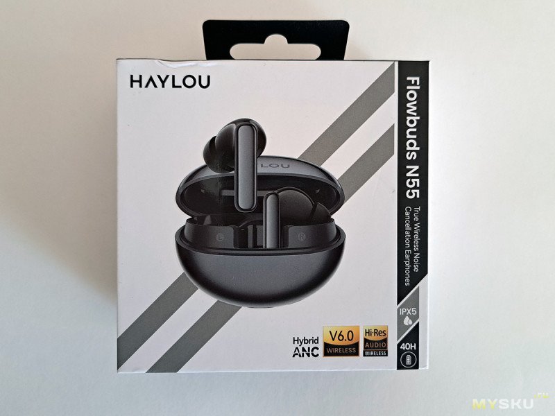 Упакованы наушники в коробку из плотного картона. Что любопытно, в правом нижнем углу коробки расположена надпись 40 ч. У большинства торговых марок автономность указывается для максимально лайтовых условий, при громкости 30-50% и отключенном шумоподавлении, усилении низких частот и т.д. Я же тестирую наушники при максимальной громкости, на пределе комфорта. Обычно это 70-80%. И как следует ожидать — цифры, как правило, не совпадают. А тут сошлось! Я сильно удивлен.