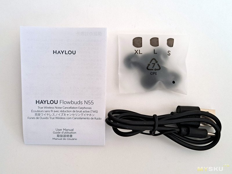 Комплектация у наушников минималистичная: только самое необходимое. Руководство пользователя, амбушюры разного размера и USB кабель.