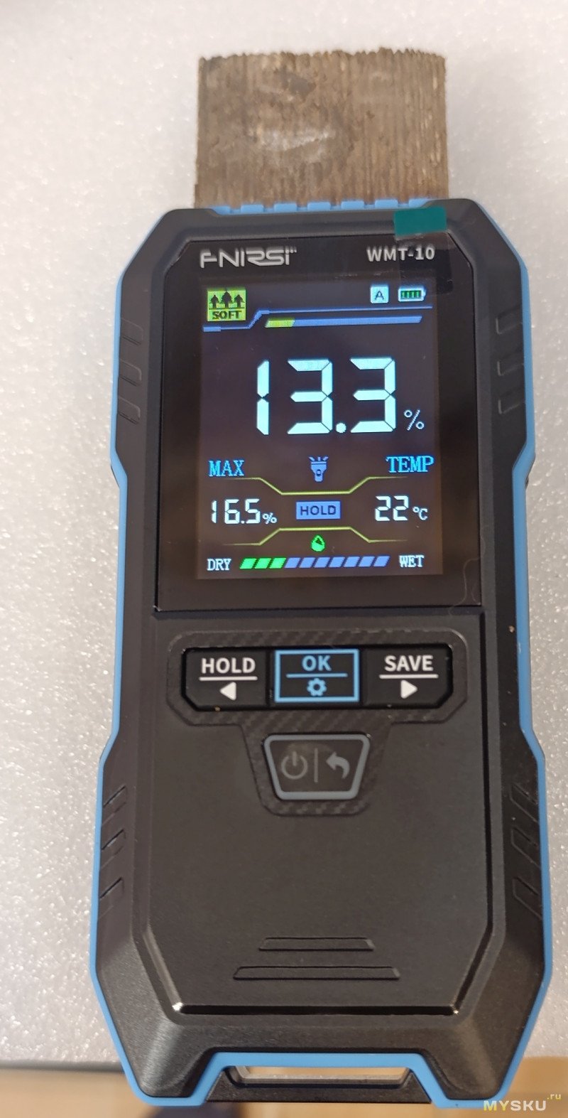 Для проверки я взял старый кусок доски, годами лежавший в сухом подвале, замерил его, затем специально намочил и высушил. Во всех случаях показания прибора оказались вполне корректными и логично отражали изменения состояния образца.