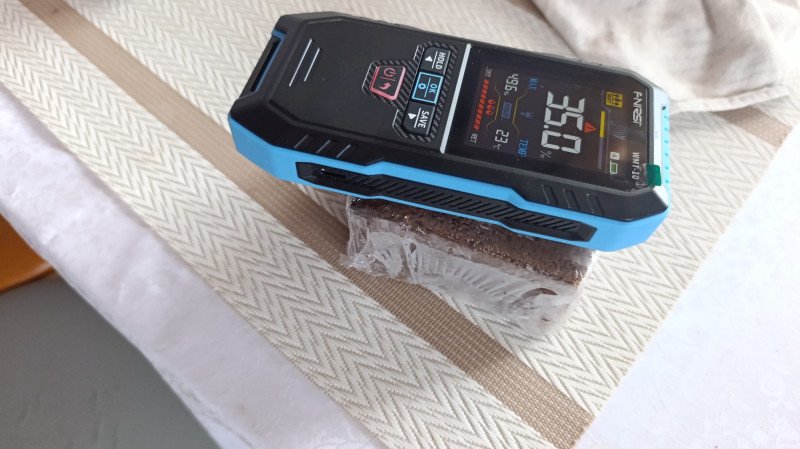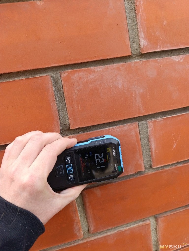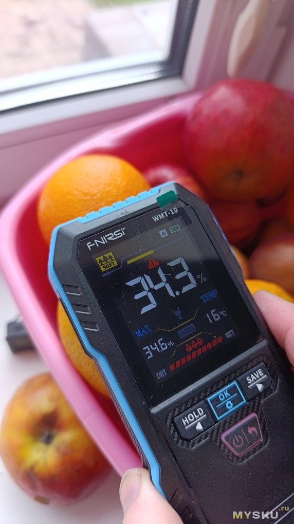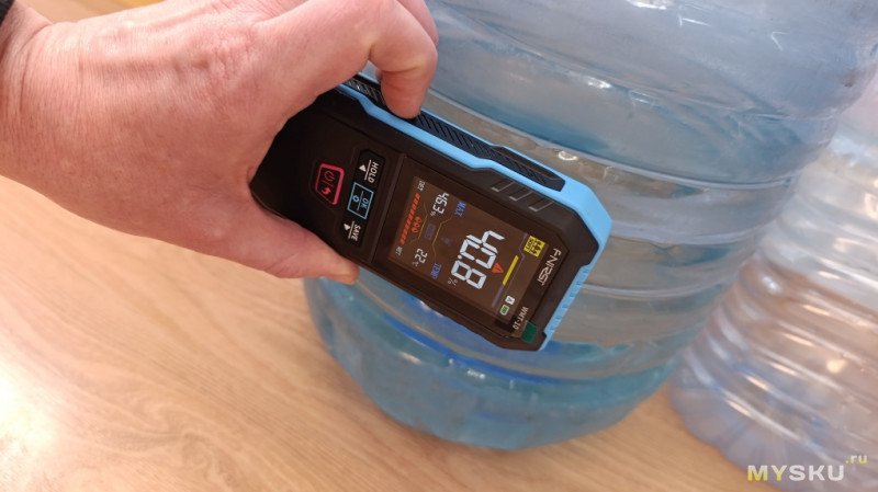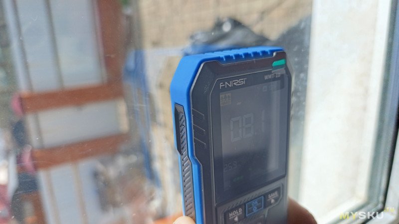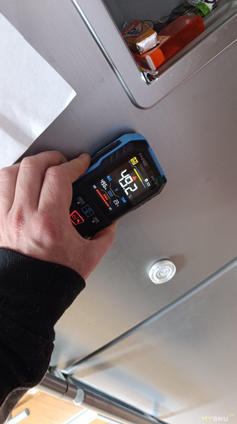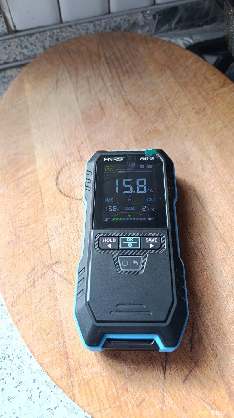 Да, у индуктивного метода точность тоже не идеальна: показания зависят от плотности прилегания датчика — если надавить сильнее, значение может вырасти на 1–2%. Но для бытовых задач этого достаточно. И спил должен быть ровный, хотя бы 3*3 см, приложить к неровному основанию или бревну не получится, тут контактный был бы лучше. Проверил стены и мебель в доме — влажность везде примерно одинаковая, расхождения в пределах 1–2% (я ожидал увидеть что какая-то стена влажная или ДСП рядом мойкой сырая, но такого не обнаружено).