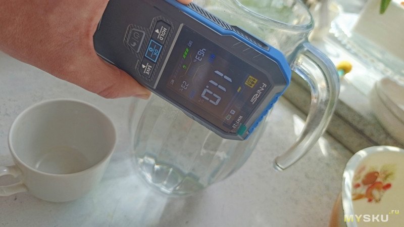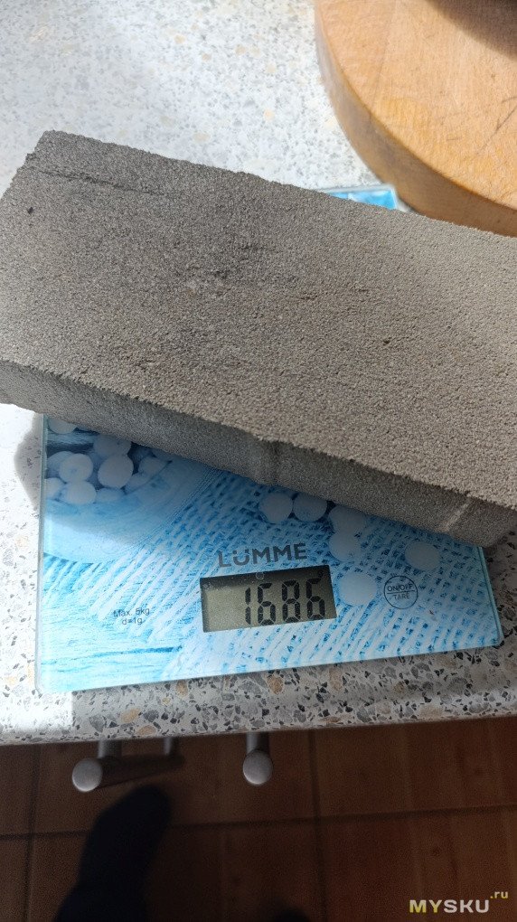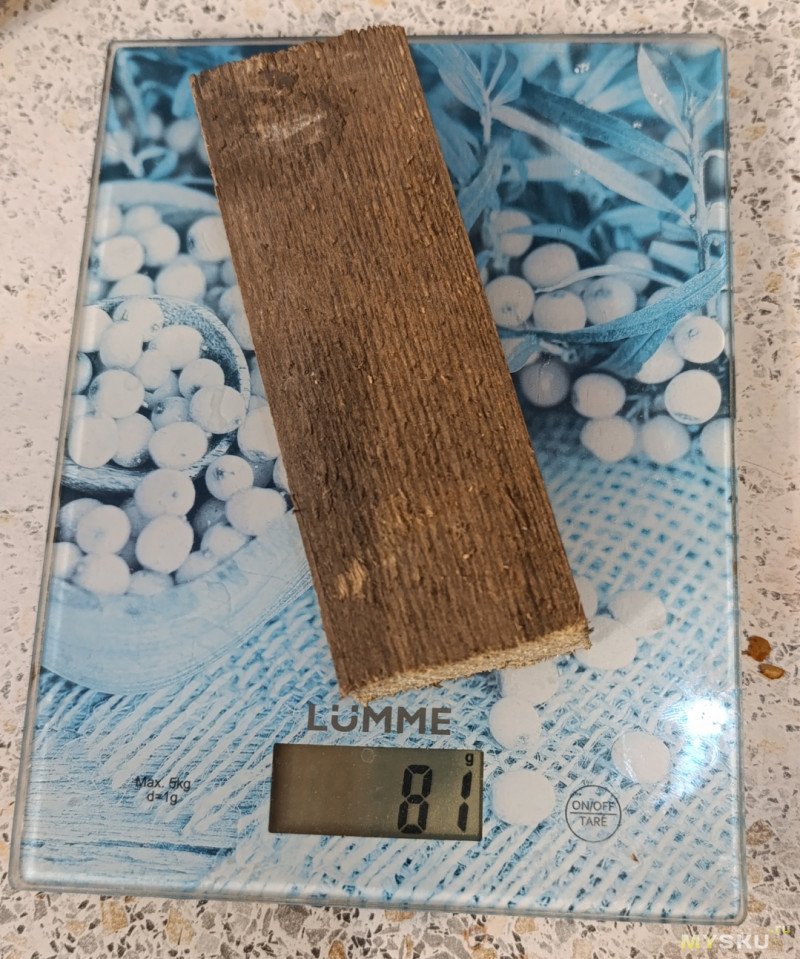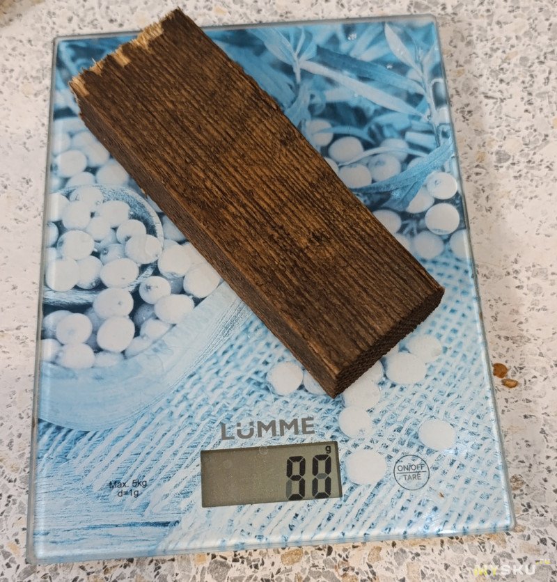 После погружения в воду: масса выросла до 90 г, прибор показал 37%. Эксперимент, правда, условный: влага вряд ли успела проникнуть глубоко вглубь, в основном смочилась поверхность, поэтому замеры стоит воспринимать как ориентировочные.