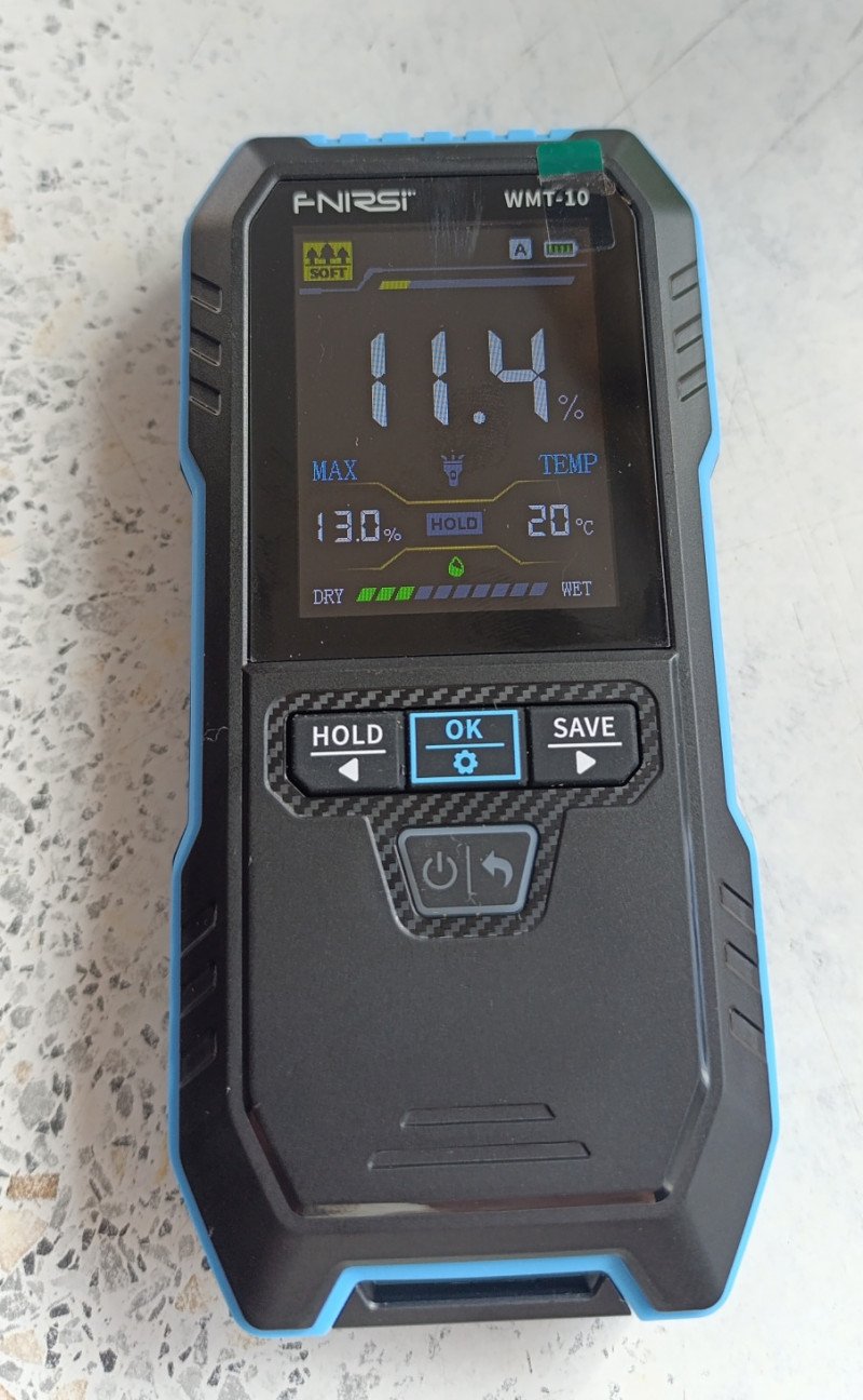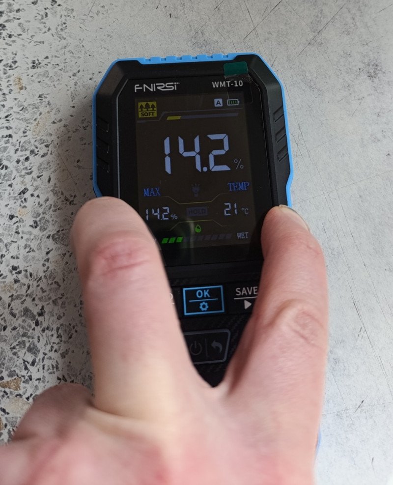 Показания прибора в целом правдоподобны, но есть систематические расхождения, характерные для индуктивных влагомеров. Полностью доверять абсолютным значениям не стоит — лучше использовать прибор для отслеживания относительных изменений.