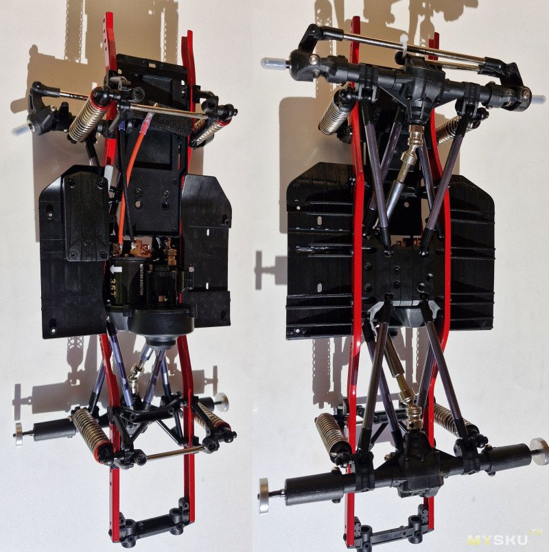 В целом шасси неплохое, много пластика да (включая поворотные кулаки), нужно приложить руки (напечатать площадку под АКБ, пошаманить с амортами), нет заднего бампера.