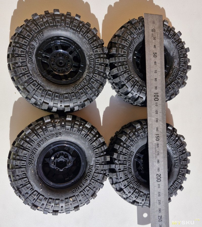 Бампер из гибкого литого пластика, не будет очень хрупким при столкновениях. Крепится на алюминиевые втулки. Колеса типовые (ширина покрышки 40 мм), внутри поролон.