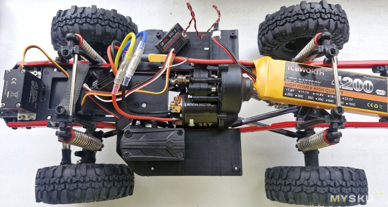 Колеса (диски пластик) сняты. Сразу установлен коллекторный моторчик на 35T (витков) 550-го размера. Больше из электроники ничего нет.