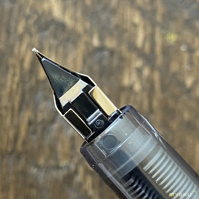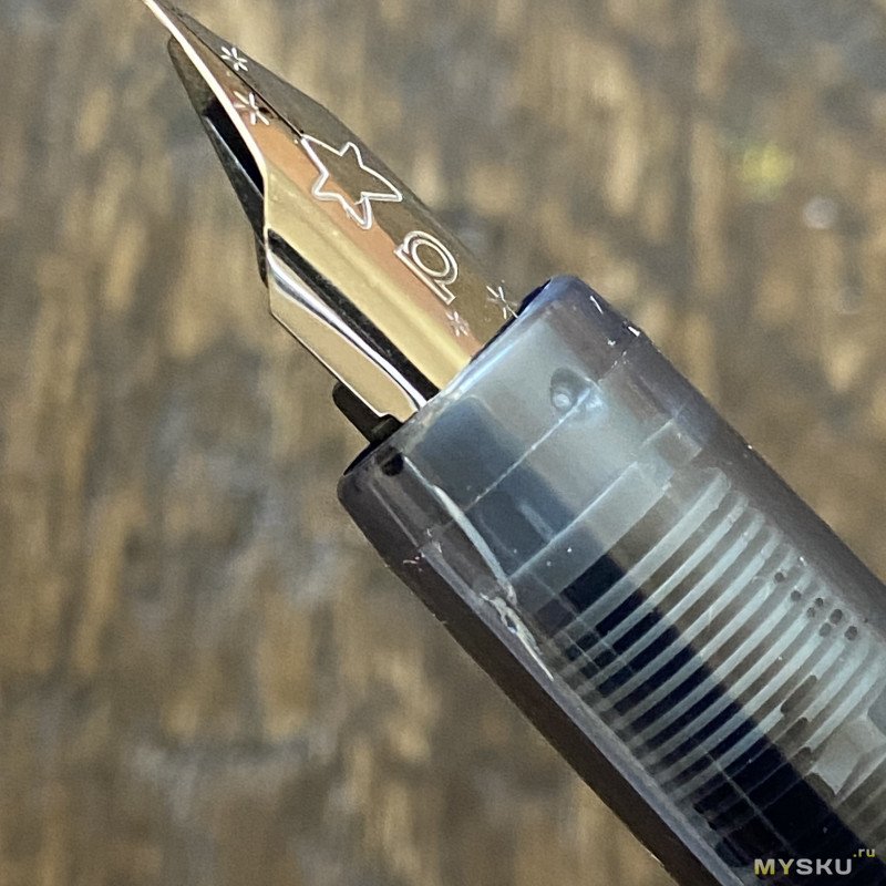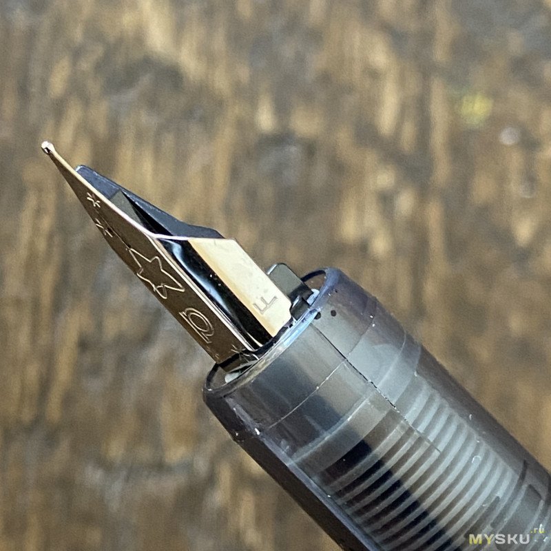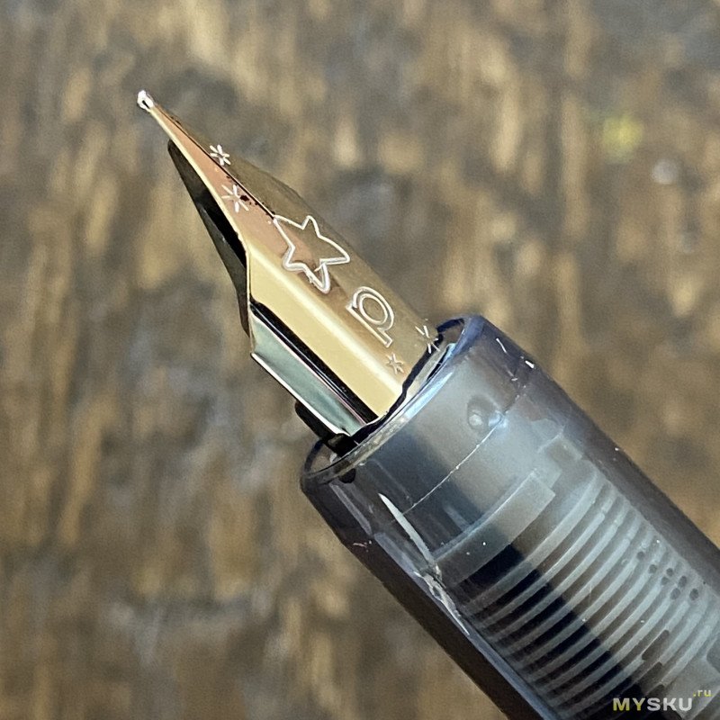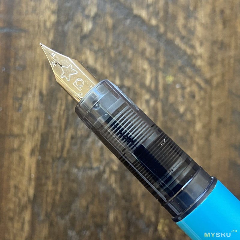 Перо с родными чернилами пишет приятно, пропусков нет, даёт небольшой фидбек. Обратной стороной пишет сухо, не царапает. Примерно такие же ощущения, как дарят перья на условных бюджетных Platinum, если вы ими писали.