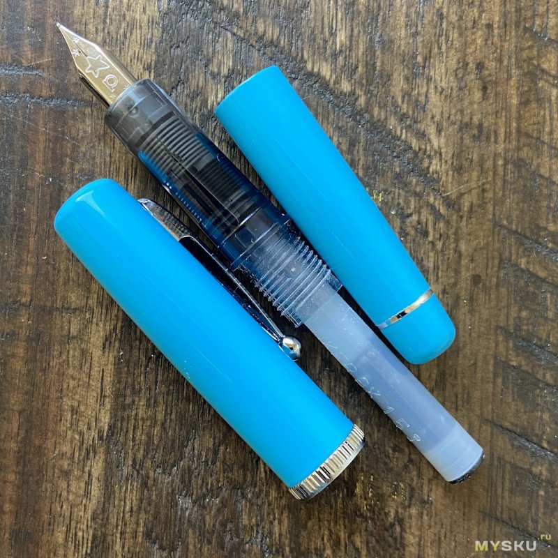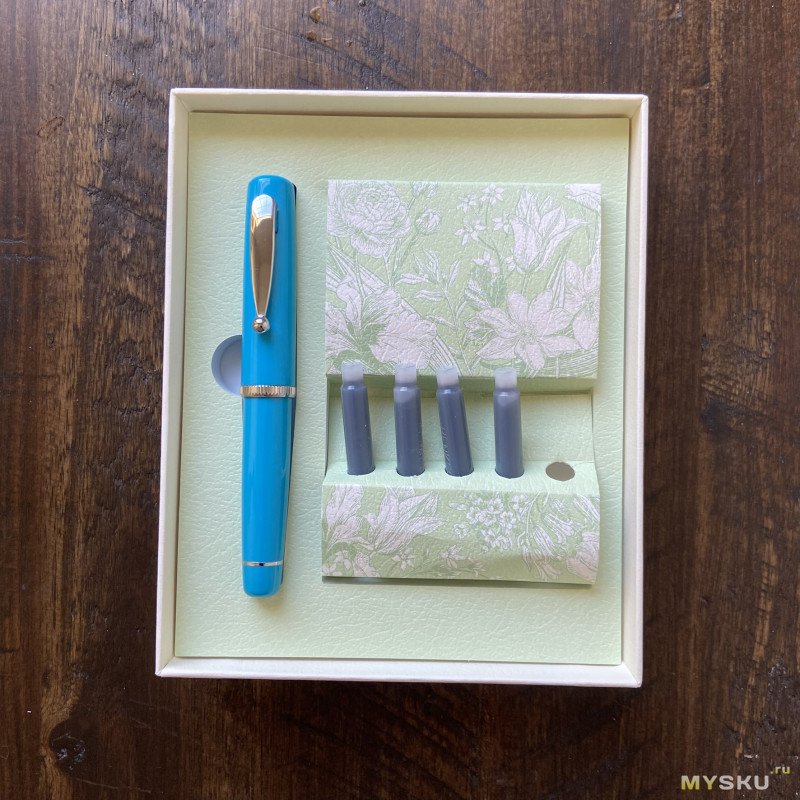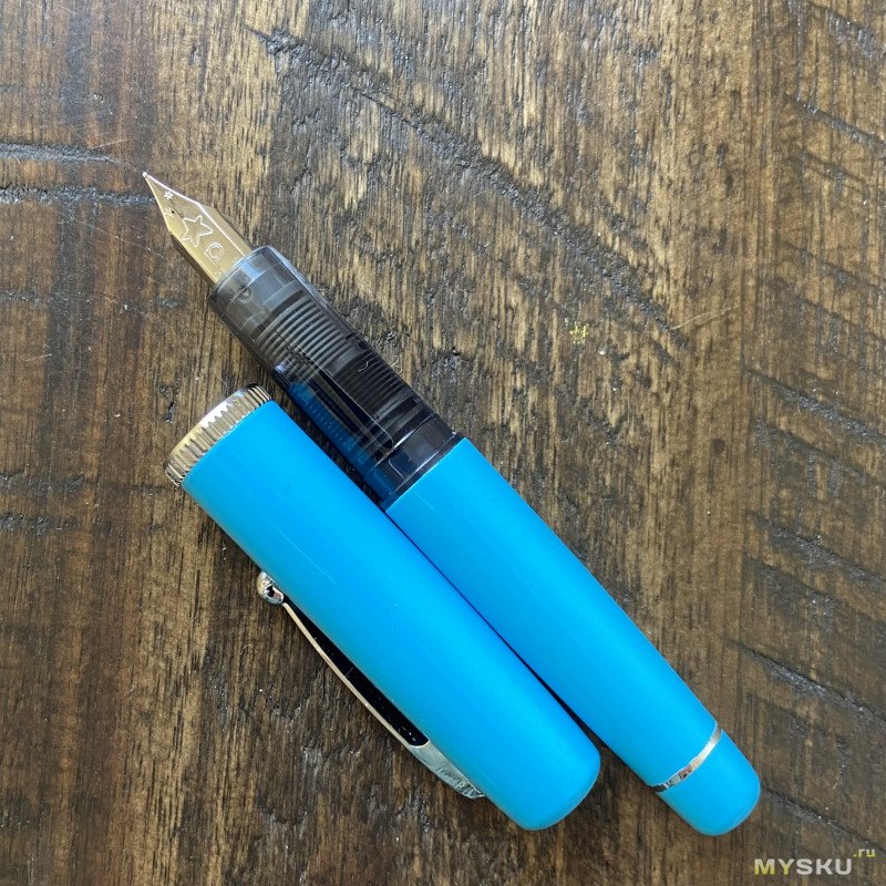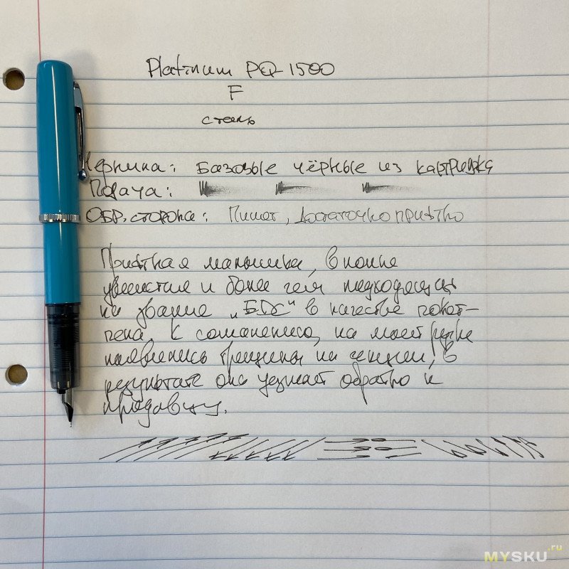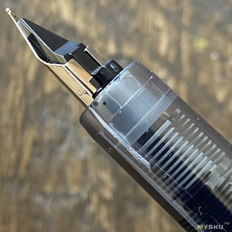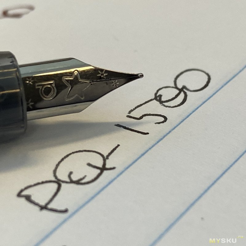 Перо с родными чернилами пишет приятно, пропусков нет, даёт небольшой фидбек. Обратной стороной пишет сухо, не царапает. Примерно такие же ощущения, как дарят перья на условных бюджетных Platinum, если вы ими писали.