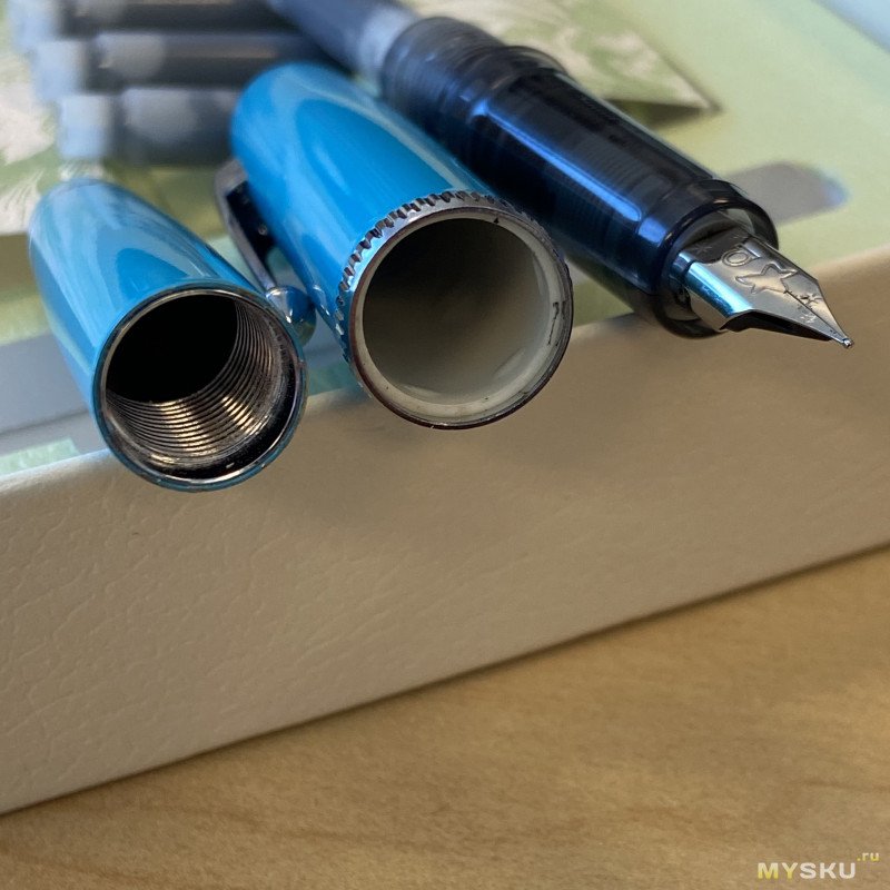 В корпусе резьба металлическая, на секции же — пластиковая. Внутри колпачка пластиковая вставка плюс есть подпружиненный стаканчик (система slip and seal), который надёжно защищает перо от высыхания.