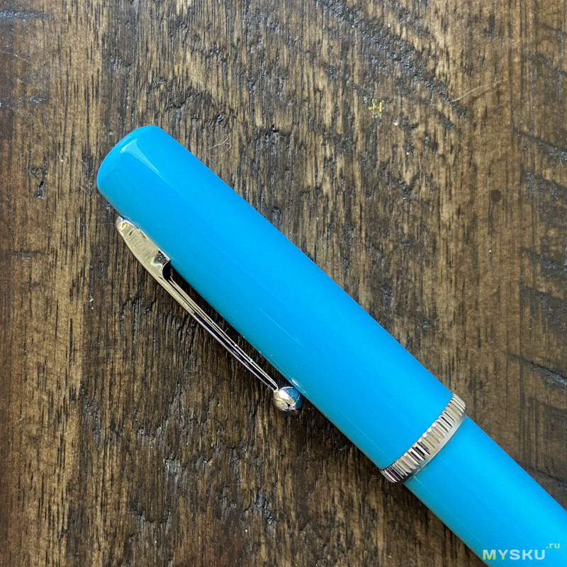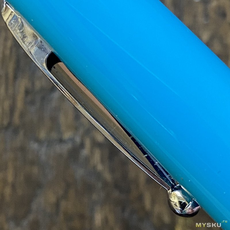 В глаза бросаются три элемента — клип, рифлёное колечко на колпачке и колечко на торце корпуса. Клип безумно тугой, прямо до безобразия — использовать нельзя, внешний вид довольно странный (скорее непривычный), внизу шарик — но это просто четыре лепестка, сложенных вместе.