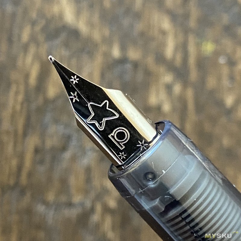 На пере логотип Platinum и куча звёзд, и оно может показаться знакомым, да и правильно — зачем изобретать что-то новое? Вот прямо точно такие же перья стоят на Platinum Meteor и, возможно, из-за них Meteor ещё называют Little Shooting Star (а может, потому, что meteor это и есть shooting star, но я в эти совпадения не верю). Сбоку пера есть обозначение толщины линии — F. Вообще, красивое перо!