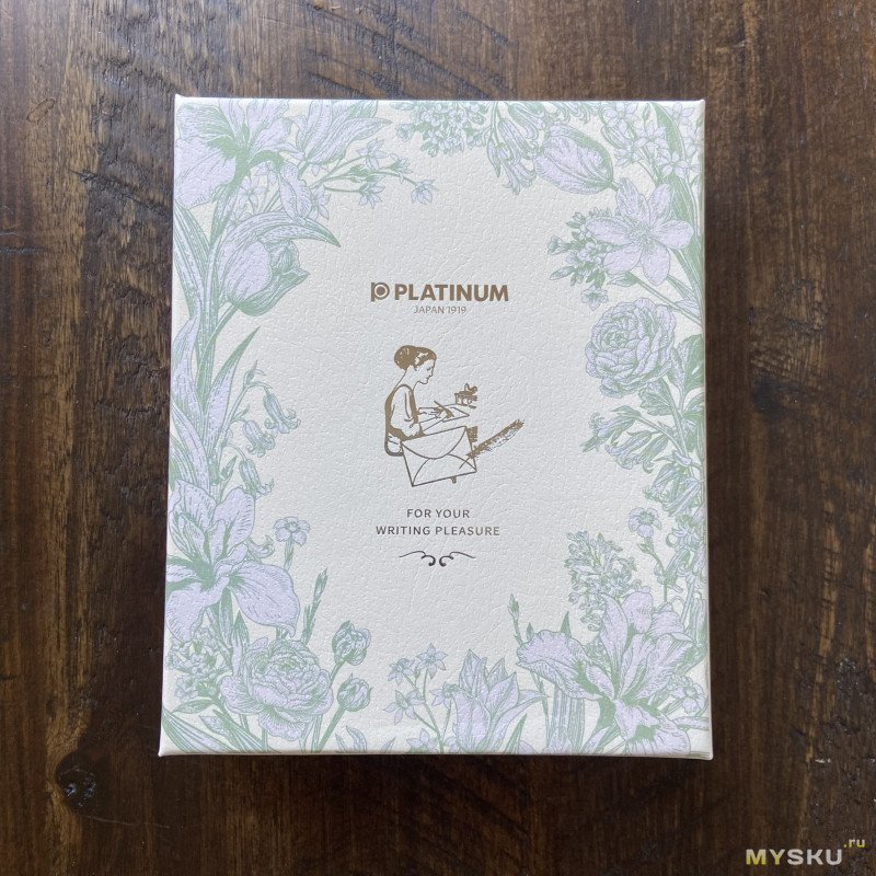 У ручки очень красивая упаковка, прямо вот подарочно-благородная, цвета — нежные, пастельные, чем-то напоминает обои. Надписи сделаны золотым тиснением.