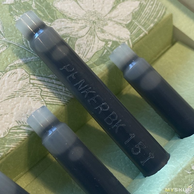 Внутри — те же красивые цветы и цвета, ручка в ложементе и набор из пяти картриджей. На картриджах написано Penker BK 15I. Предположу, что первое — это производитель, второе — цвет (black), и какой-то внутренний код или дата производства.