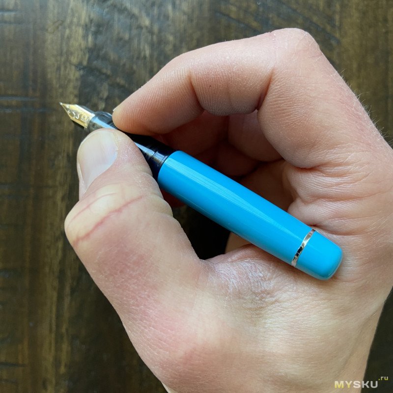 Несмотря на свою (её?) компактность, ручка достаточно комфортно лежит в руке, чтобы сделать быструю запись на лету, но дольше нескольких строчек мне так писать неудобно, хочется надеть колпачок. Он держится не прямо уж хорошо-хорошо, но есть небольшой лайфхак (всегда работает в подобных случаях): при надевании колпачка на торец ручки надо его (колпачок) чуть-чуть прокрутить, тогда он сядет очень надёжно. Небольшой дисбаланс, вносимый колпачком, совершенно не ощущается — вся конструкция идеально ложится на кожу между пальцами. Веса вполне хватает как без, так и с колпачком — ручка не кажется лёгкой.