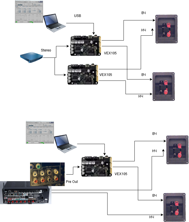 Собрать комплекс: источник звука — разветвитель — Vex105 — НЧ и разветвитель — Vex105 — ВЧ