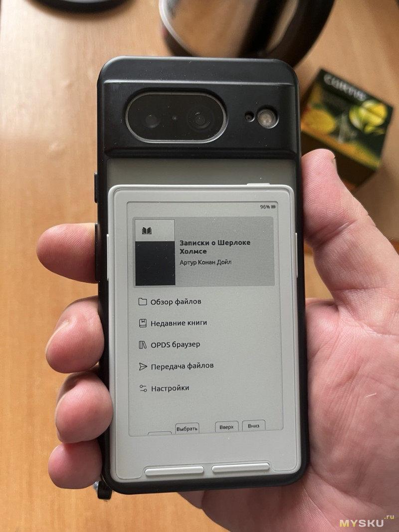 Однако, со временем потихоньку перебрался обратно на телефон. Всё хорошо у электронных книг, кроме габаритов. Подумывал о телефоне на E-ink. Но, у них всех слабое железо и плохая поддержка. И вот, наткнулся как-то на интересный ролик. В нём парень крутил в руке маленькую читалку. А потом — хоба!.. и примагнитил её к спине своего айфона. Я понял, что тоже такое хочу.