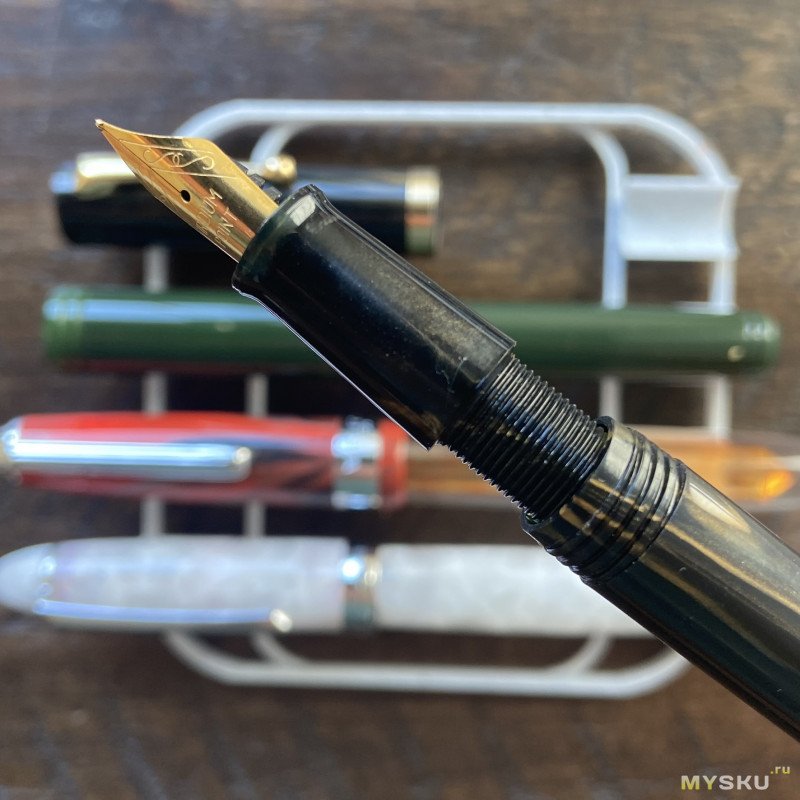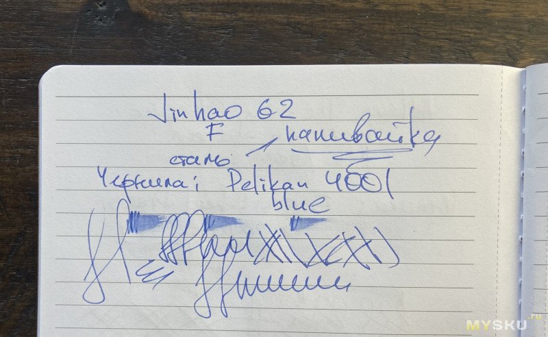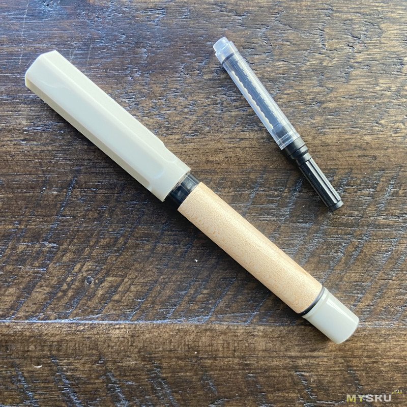 Ну вот и всё — пока делал фотографию, ручка уже готова писать. Тут всё по-джинхаовски привычно, твёрдое и жёсткое перо, пишет ожидаемо и предсказуемо. Что же касается «наливаемости» ручки — то тут тоже всё хорошо: деревянная вставка вокруг достаточно толстого пластикового корпуса неплохо предохраняет ручку от нагрева воздуха внутри, и чернила из этой ручки у меня ни разу наружу не выплеснулись. Плюс ручка не засыхает ну очень долго, что тоже большой плюс для наливайки.