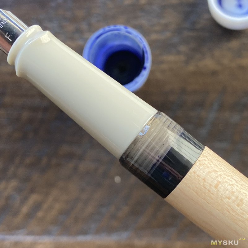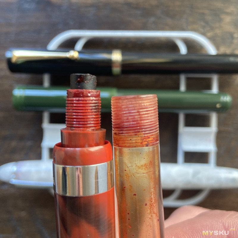 Далее собираю аккуратно, чтобы ничего не расплескать, закручиваю секцию и переворачиваю ручку. Некоторые ручки начинают писать буквально через 20-30 секунд, иногда надо ждать дольше, и тут есть лайфках — для ускорения процесса напитывания фидера чернилами можно макнуть перо в чернила.
