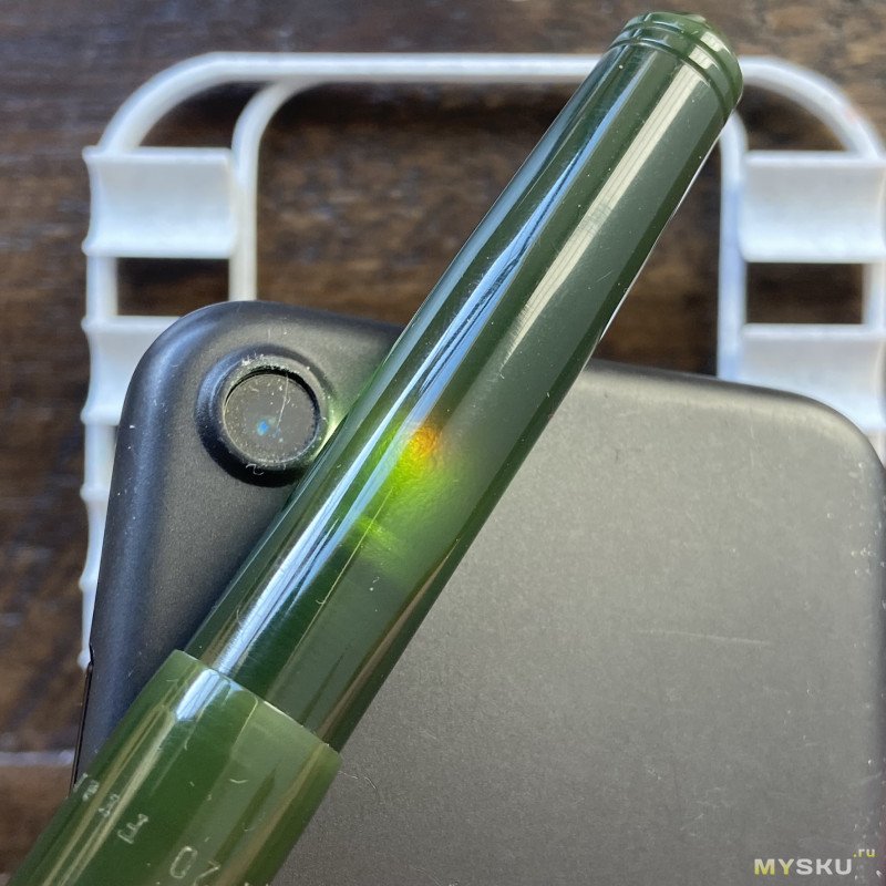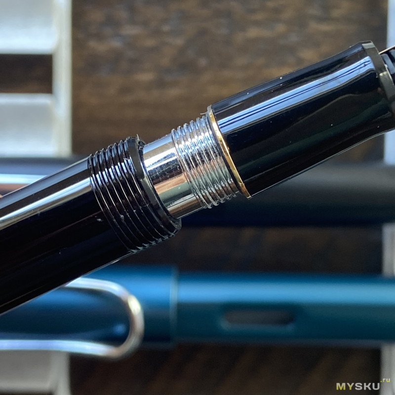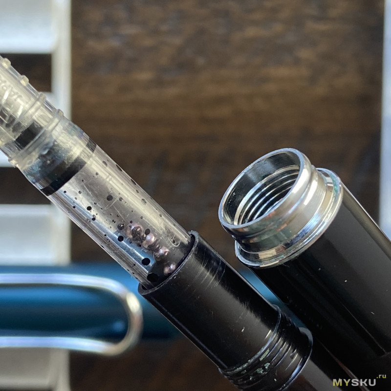Здорово, что у Jinhao 62 есть пластиковая вставка, которая играет роль окошка для контроля за уровнем чернил — очень удобно. Через эту же вставку видно, что силикон плавно заполнил зазоры в резьбе, и чернила не просочились наружу.