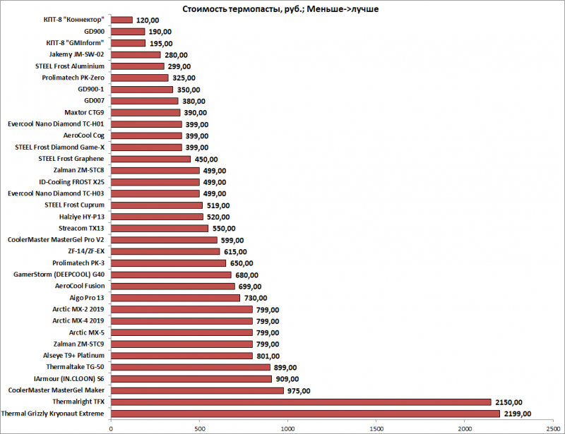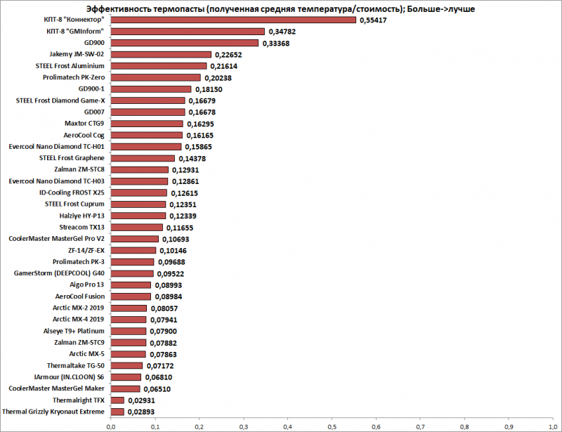 К этому абзацу стоит относится с поправкой на 4 года. Соотношение цены и результата. Смотреть на него стоит исключительно ради любопытства. Логично, что вариант «совсем без пасты» лидирует по экономии (траты нулевые), но температурные показатели вас вряд ли порадуют. Бюджетные составы, прошедшие по температурам, традиционно окажутся на вершине этого чарта. Однако разница в три градуса в конкретном сценарии может оказаться критичной, так что оценивайте под свою задачу. В ноутбуке 3 градуса могут быть на стыке «вроде бы пойдет» и «я сейчас оглохну».