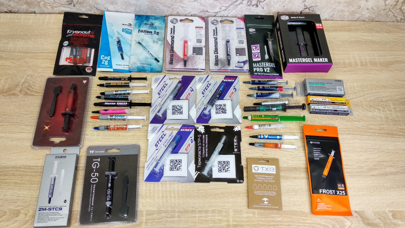 Без легендарной КПТ-8 подборка также не могла обойтись — это же практически имя нарицательное, как и Arctic MX (правда, MX-3 уже канула в лету, а на MX-5 повесили ярлык EOL, обещая вскоре замену *поправка на время, паста уже продается*; мой старенький образец MX-4 2012 года, увы, иссяк до завершения опытов). От Id-Cooling есть Frost X25 — по сути, это розничная версия TG-25, которую частенько кладут в коробки с фирменными кулерами. Добавил и GamerStorm (DeepCool), который приехал ко мне ещё в наборе с суперкулером Assassin III. Ну и, конечно, целая россыпь «китайцев»: популярные вариации GD и просто недешёвые экземпляры, неплохо засветившиеся на предварительном этапе.