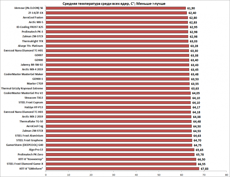 Средняя температура по всем ядрам. Куда более полезный ориентир, так как сглаживает случайные всплески; именно этот график лучше всего отражает реальную эффективность.