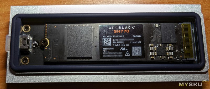 Шина диска — USB 3.2 Gen 2 (до 10 Гбит/сек). У меня такой USB-порт только в сервере. Вот в нём и проверим. Диск — WD_BLACK SN770.