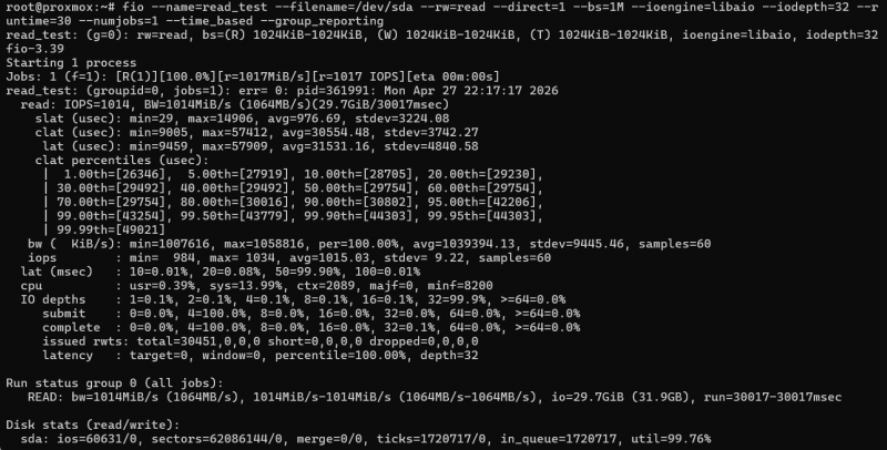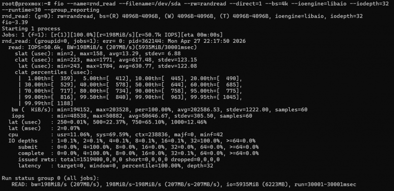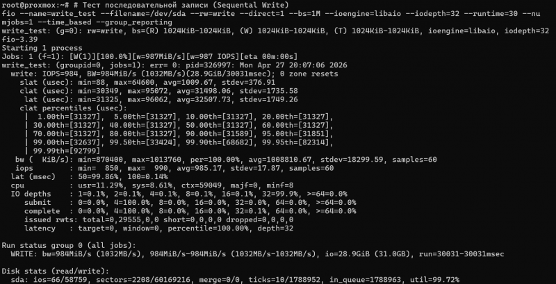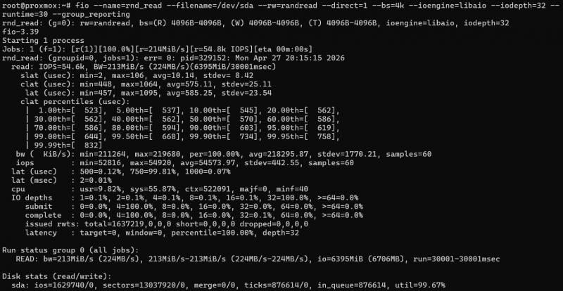 - Latency (clat): avg=575.11 usec — средняя задержка меньше миллисекунды (0.5 мс).