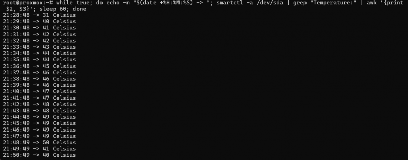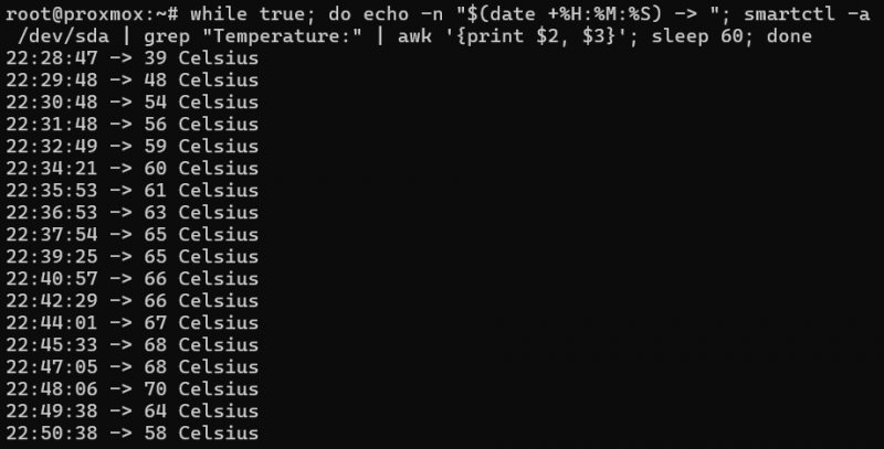 Запустил непрерывную запись на диск на 20 минут и снимал показания температуры каждую минуту.