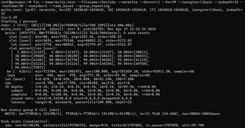 - BW: 213 MiB/s (224 MB/s) — на мелких блоках по 4 КБ такая пропускная способность означает, что диск будет ощущаться очень «отзывчивым».