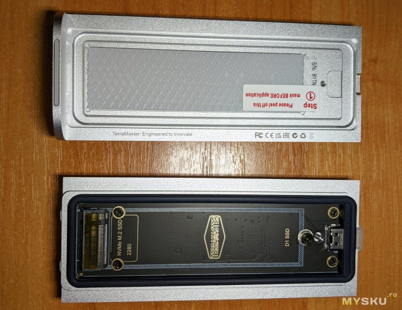 Крепление двух половин — одним винтом. Внутри только одно посадочное место под диск M.2 (M Key / B+M Key), типоразмер 2280. Это и логично: нет смысла брать полноразмерный корпус под «коротышек». Также в корпусе уже есть термопрокладка на верхней крышке.