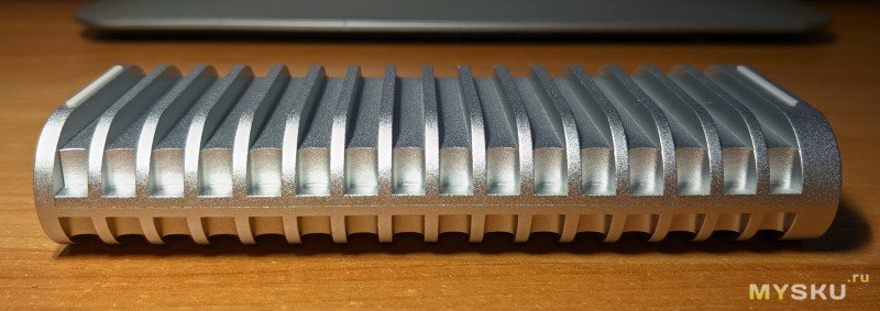 Внутри чехла нас ожидает сам продукт. Вещь действительно массивная, вес 146 грамм. Корпус, которым я пользуюсь, в сравнении с этим — просто невесомый. Рёбра симметрично разнесены по обе стороны корпуса, выглядит достаточно эффектно. Хочется оценить такое решение в температурном тесте.