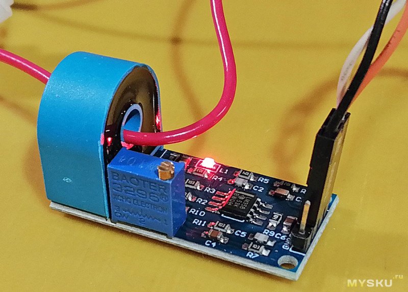 Это гальванически изолированный датчик силы переменного тока от 10 мА до 5А. По сути трансформатор тока на плате с операционным усилителем, позволяющим регулировать напряжение на выходе модуля. Согласно спецификации на токовый трансформатор, гальваническая развязка обеспечивает безопасность от импульсных скачков напряжения амплитудой до 4.5 kV.