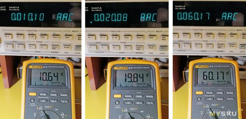 Результаты калибровки на небольших токах. Вверху амперметр переменного тока в первичной цепи. Внизу милливольтметр постоянного напряжения на выходе платы.